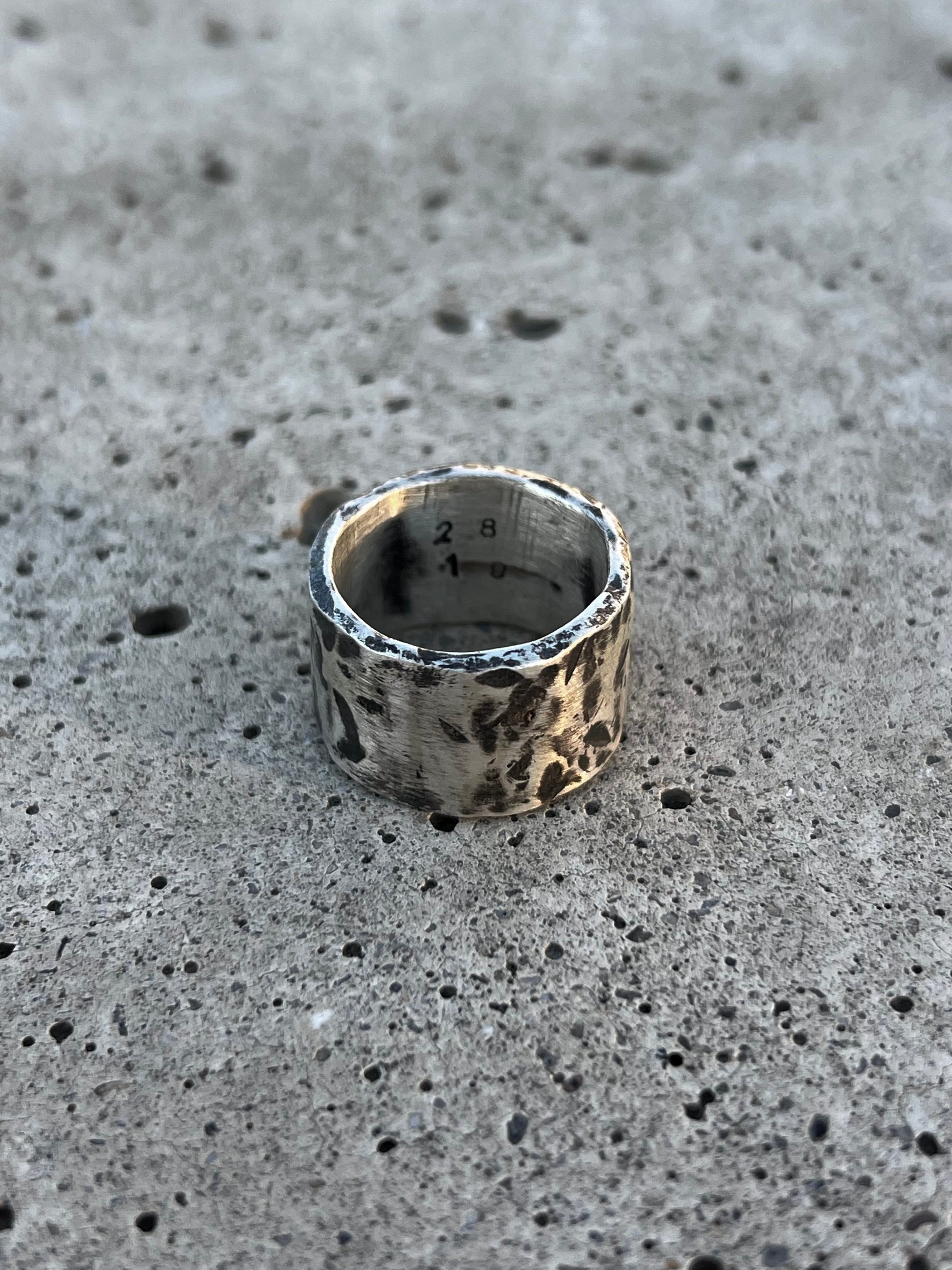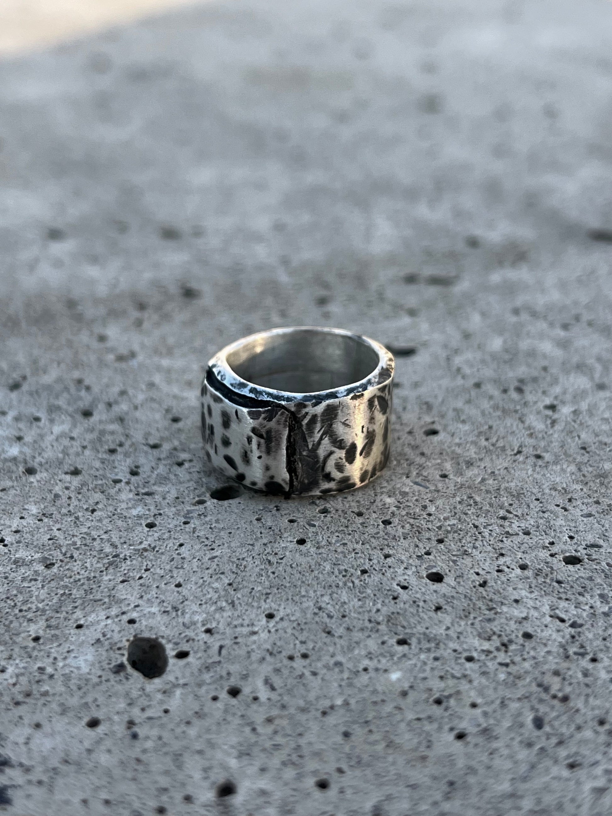 Dieser einzigartige Ring verfügt über eine rohe, gehämmerte Oberfläche mit oxidierten Akzenten.