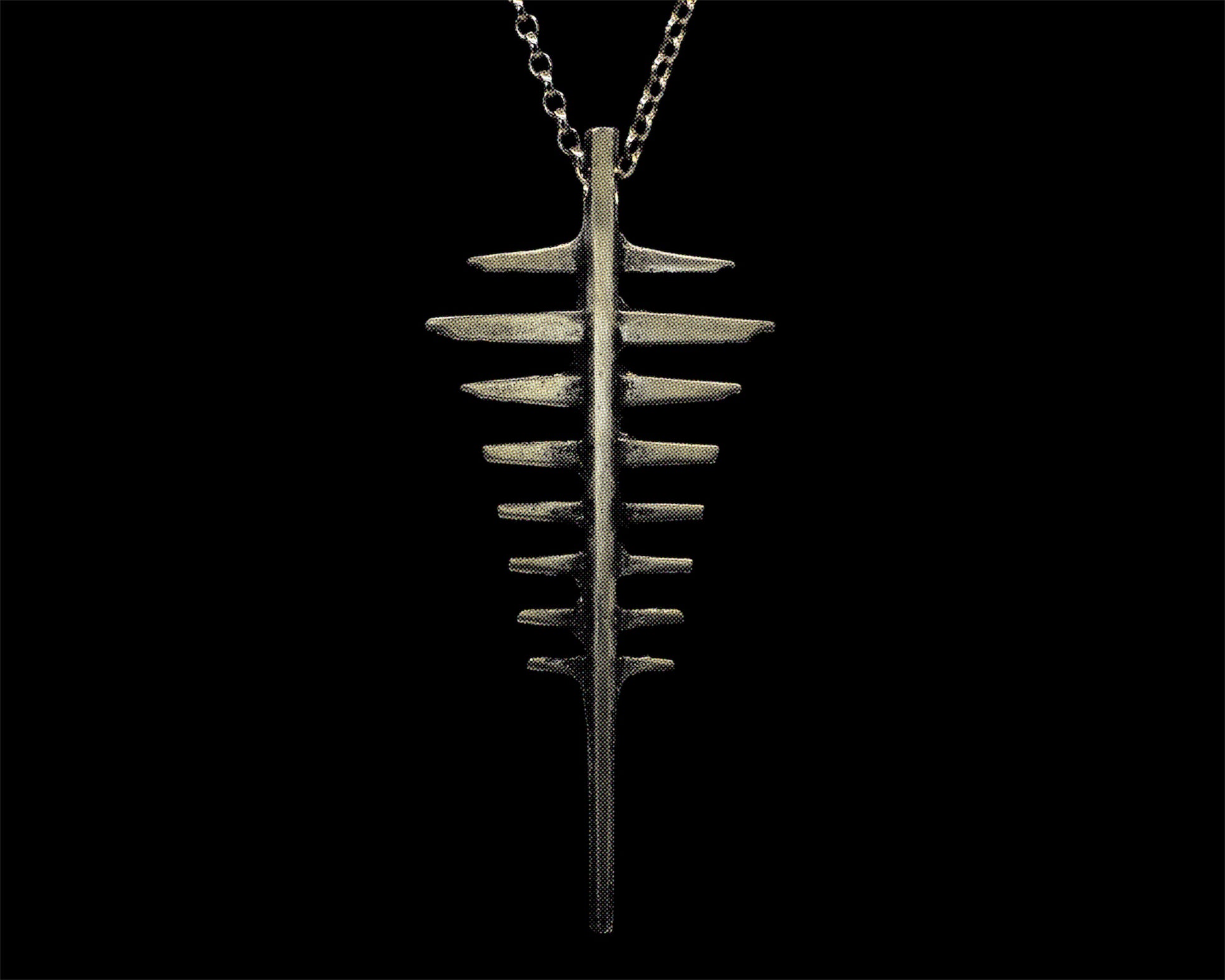 Handgefertigter Silberanhänger mit mystischer Form und mehreren langen "Rippen", die aus der Mitte des Anhängers hervorgehen.