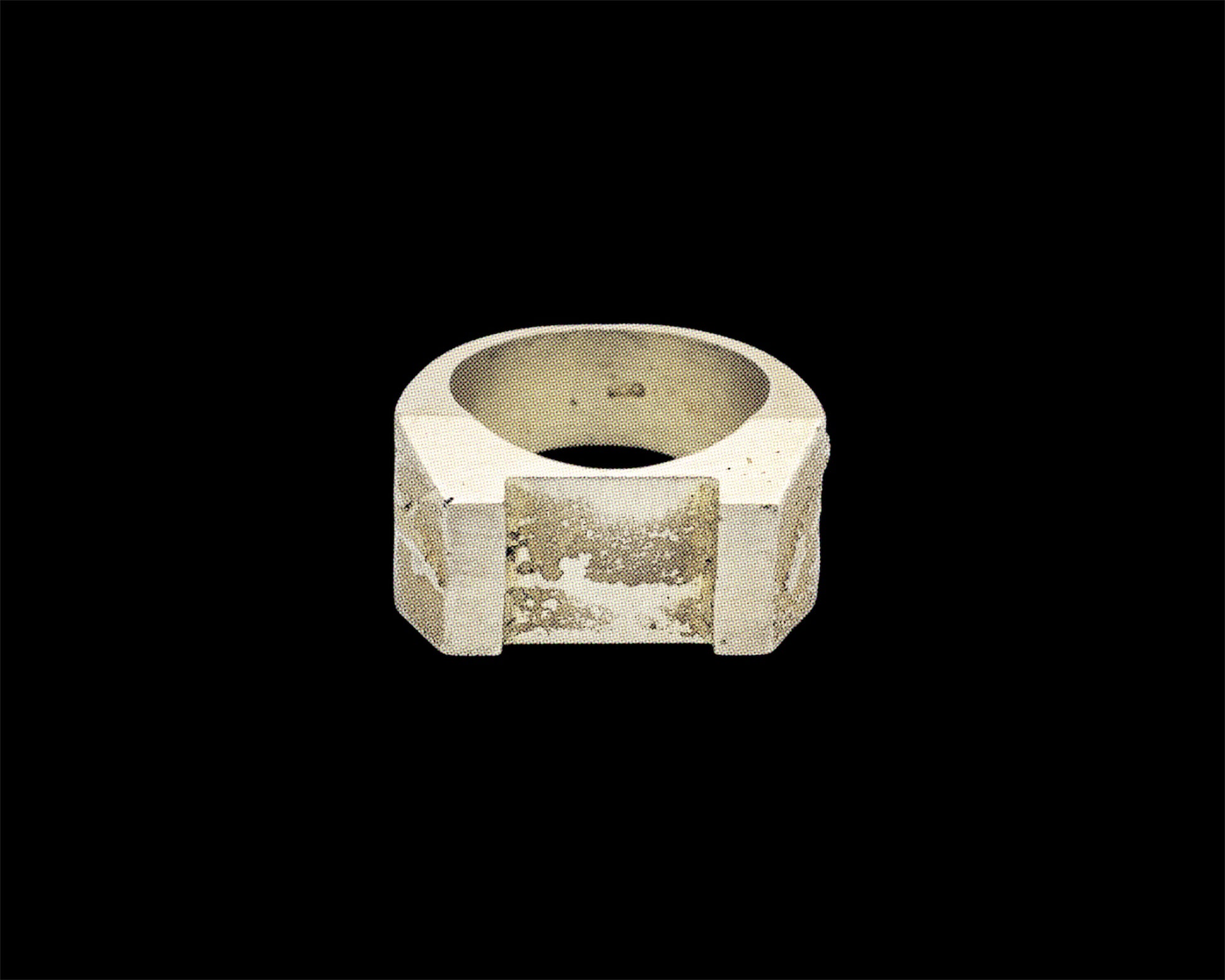 Bague sculpturale à la surface argentée brute et pourtant brillante.