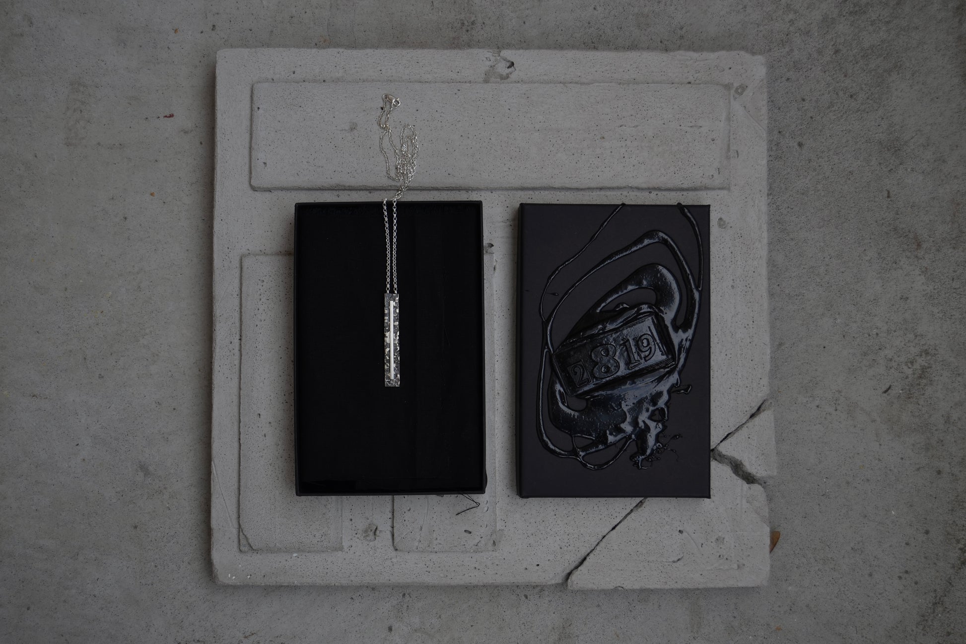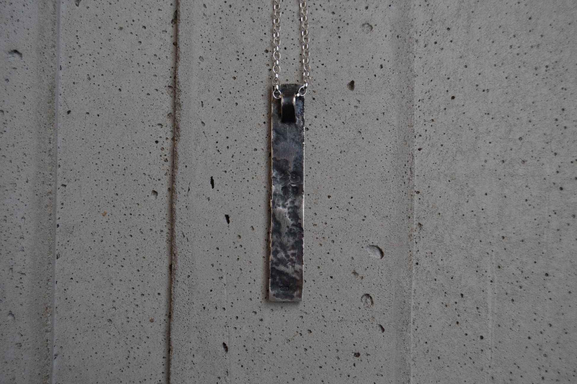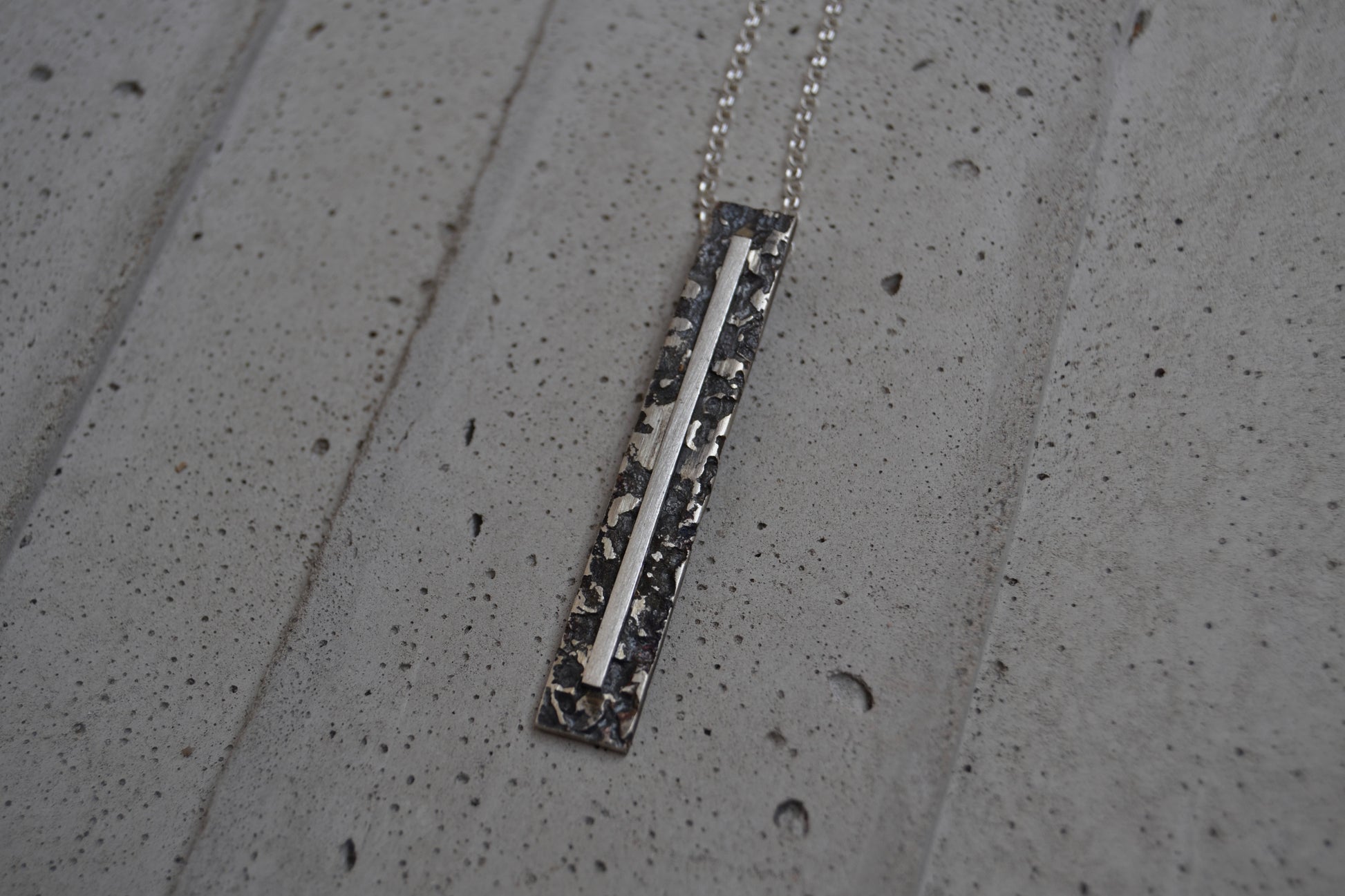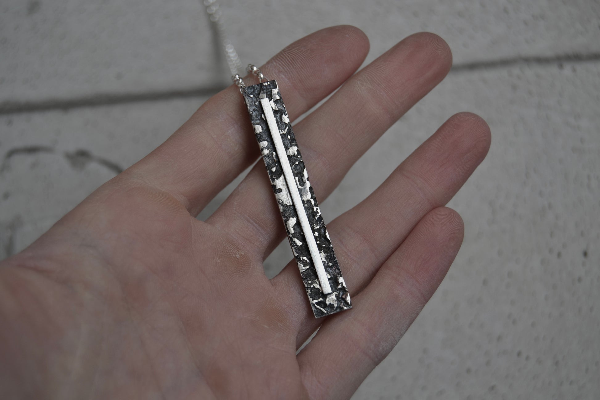 Pendentif en argent original, à la surface fondue et aux accents oxydés.