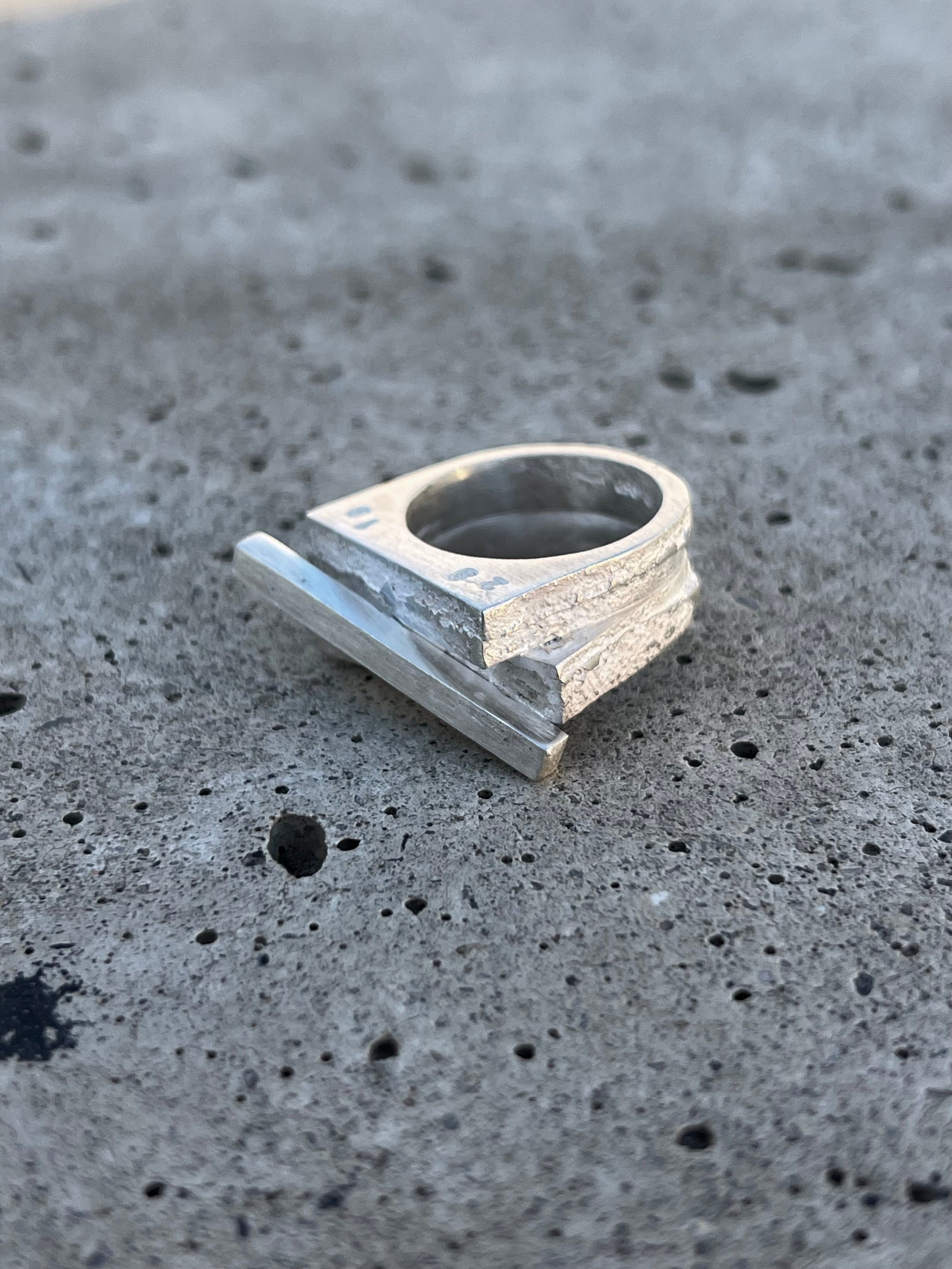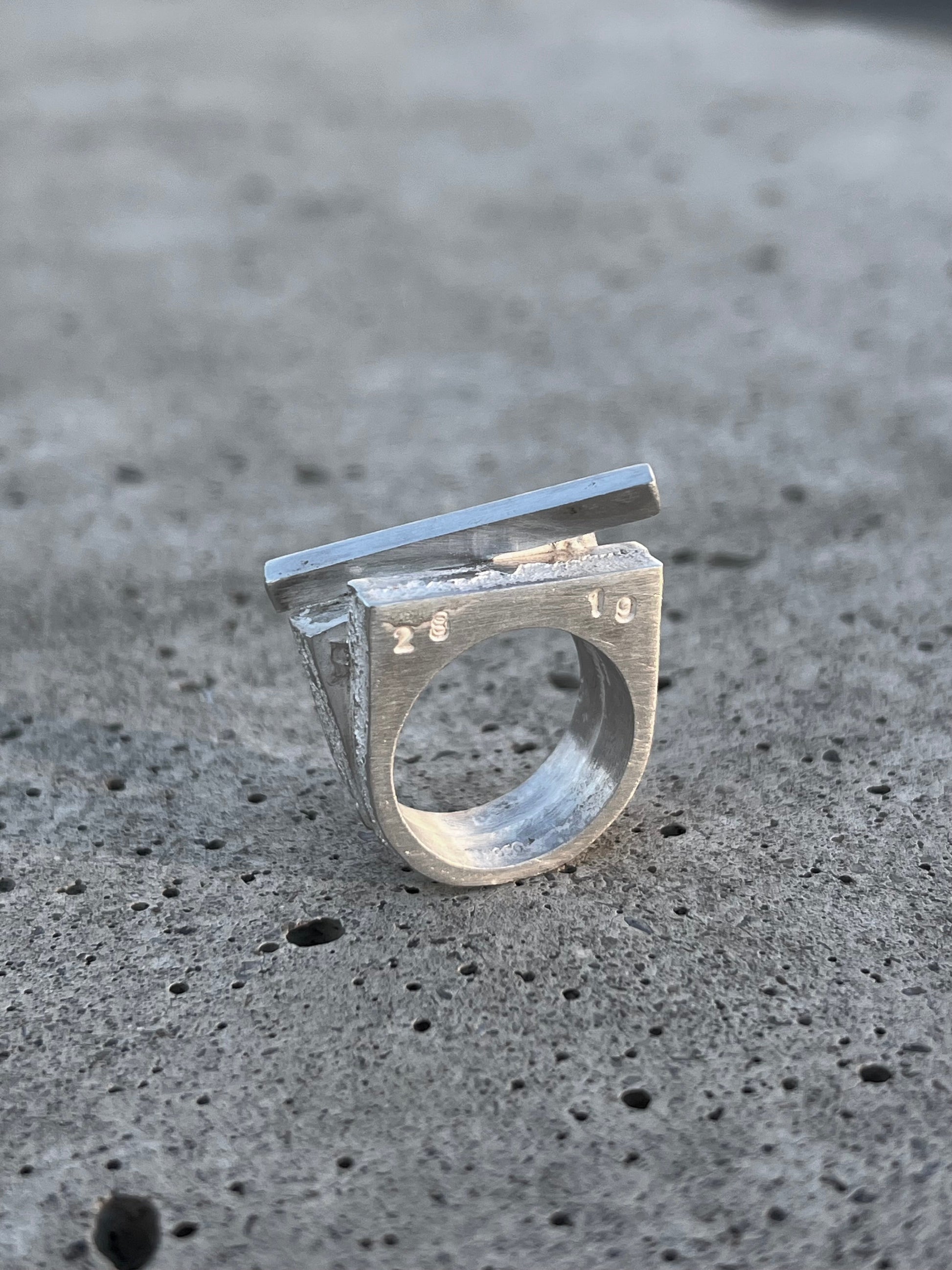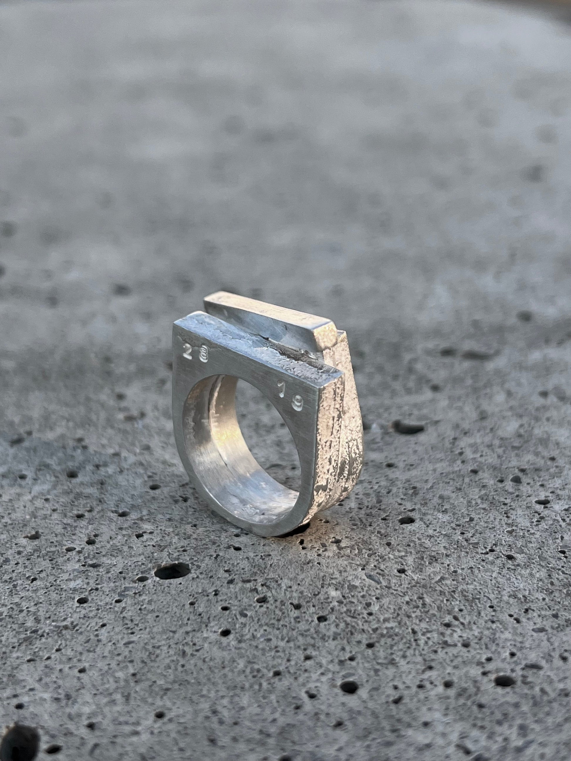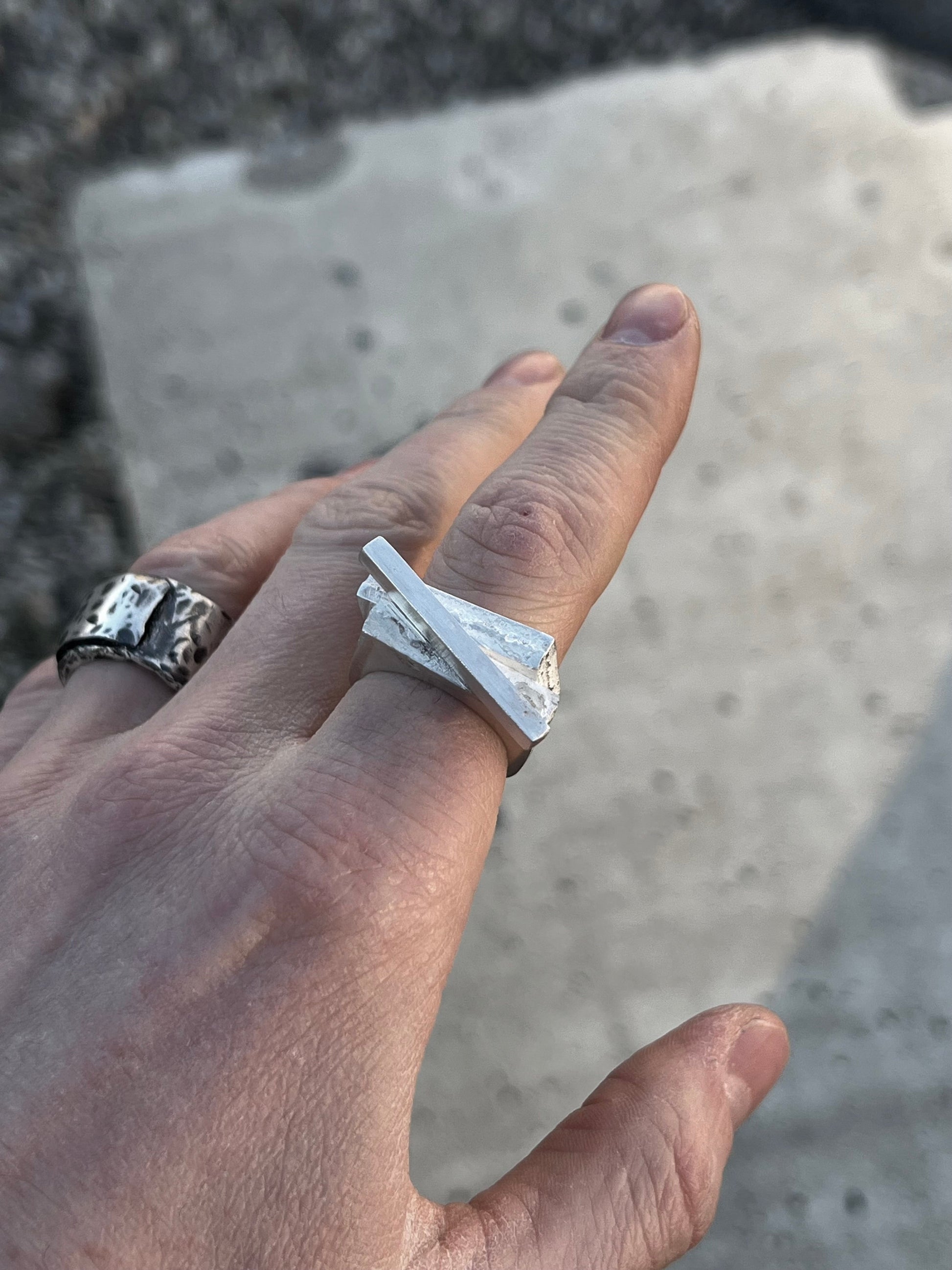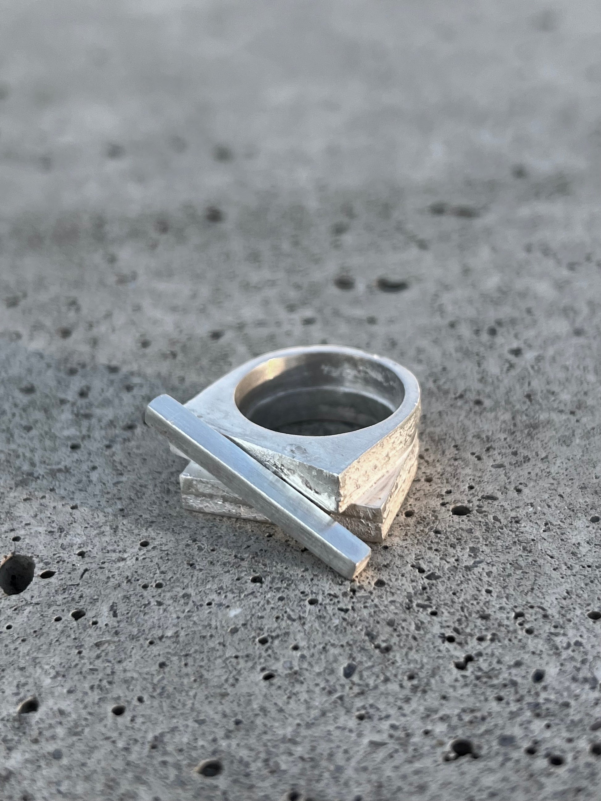 For this ring, two singular rings have been fused together with a silver bar to create a new sillhouette.