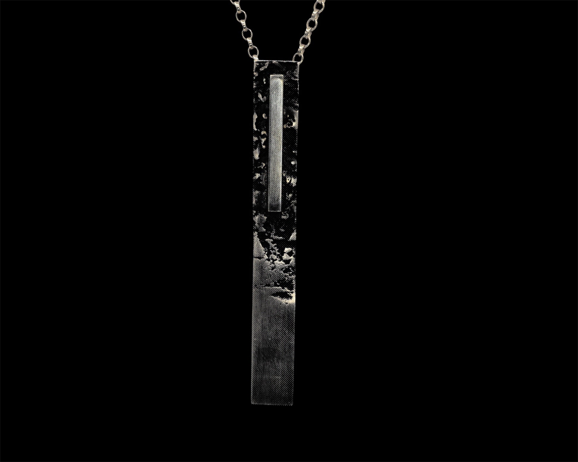 Distinctive silver pendant with a melted surface and oxidized accents.